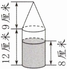 30. (2024·苏州太仓)如图,一个密闭的容器是由圆柱和圆锥组成的,圆柱和圆锥的高分别为12厘米、9厘米,容器内的水面高8厘米。如果将这个容器倒过来放置,那么从圆锥的顶点到水面的距离是多少厘米? (容器壁的厚度忽略不计)