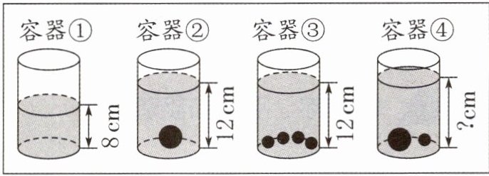 13 【解析】观察题图②可知,一个大钢球放入水中,水面升高了12-8=4(cm);观察题图③可知,四个小钢球放入水中,水面升高了12-8=4(cm),所以一个小钢球放入水中,水面会升高1 cm,题图④中放入了一个大钢球和一个小钢球,水面会升高5 cm。