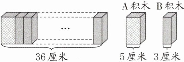 48. (2024·南通海安)将A、B两种积木没有规律地横排拼接成一个大的长方体(如图),已知大长方体的总长是36厘米,一共用了10块积木。A、B两种积木各用了多少块?