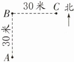 (1) (2024·盐城盐都区)小亮从点$A$出发,向北走30米到达点$B$,再从点$B$向东走30米到达点$C$(如图)。小亮回头看点$A$,发现点$A在点C$的(