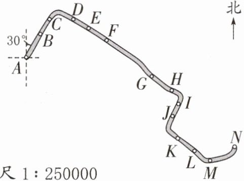 )°方向行驶到$B$站。(2) 从图上量得$M站到K$站的距离大约是0.8厘米,那么这两站之间的实际距离大约是(