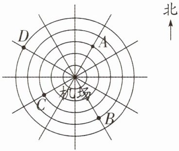 (5) (2023·南通启东)一个飞机的雷达屏幕如图所示,每相邻两个圆之间的距离表示10km,最小的圆的半径也为10km。以机场为观测点(机场在中心点处),下面关于四架飞机的位置描述,正确的是(