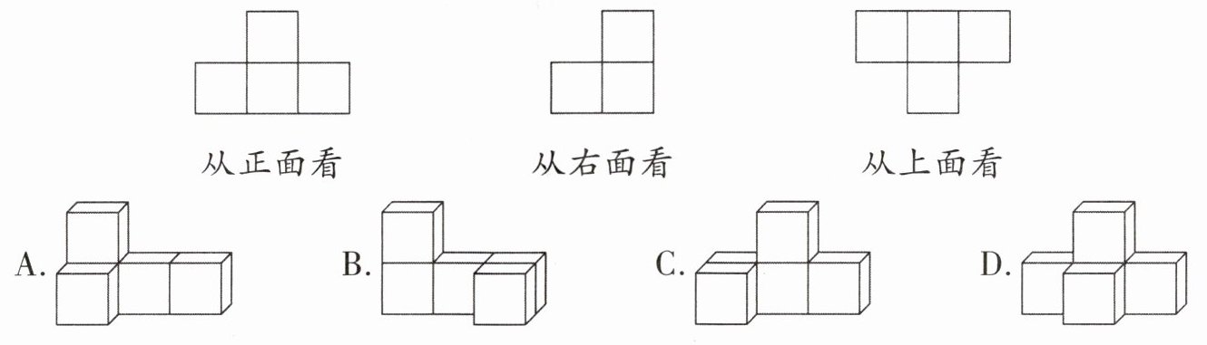 1. 一个立体图形,从正面、右面、上面看到的图形如下图所示。用5个小正方体搭成这个立体图形,则这个立体图形是()。