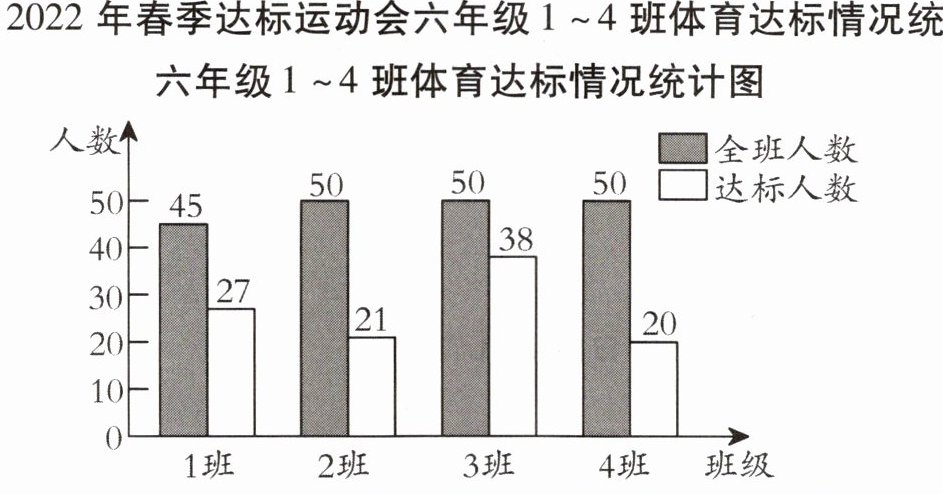 二、下图是某学校2022年春季达标运动会六年级1~4班体育达标情况统计图。