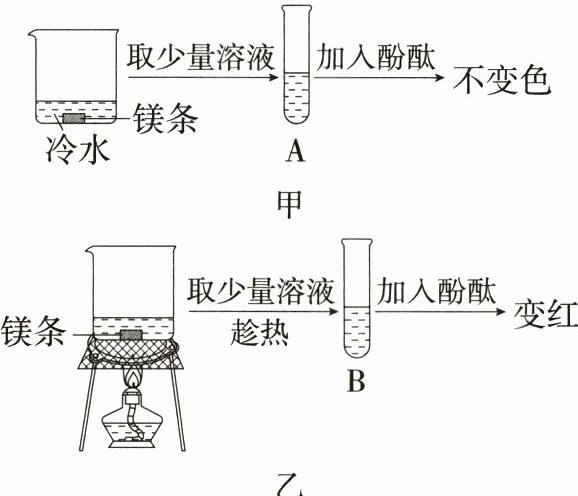 16. 小科在学习金属活动性顺序后,知道钾、钙、钠的金属活动性特别强,能与水反应生成碱和氢气。他猜想:在金属活动性顺序中镁排在钠后面,镁是否也能与水反应呢?于是他在两个烧杯中都分别加入等量的冷水和镁条,分别如图甲和图乙所示进行操作。实验过程和现象如图: