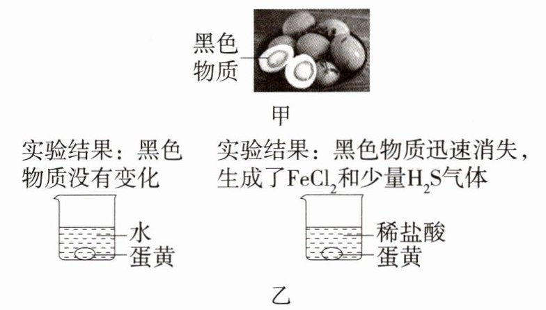12.新课标科学探究「2024绍兴柯桥联盟月考」茶叶蛋的蛋黄表面有一层黑色的物质(如图甲),有人担忧它是否能食用。小明决定利用科学知识来揭秘。他取两个带有黑色物质的蛋黄开展实验,实验结果如图乙。