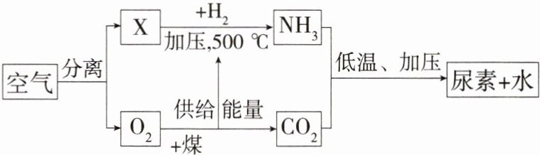 解析 (1)空气的主要成分是氮气和氧气,X与H₂在加压、500℃的条件下生成NH₃,从空气中分离出的X为氮气。(2)由流程图可知,反应物为二氧化碳和氨气,生成物为尿素和水,反应条件为低温、加压。