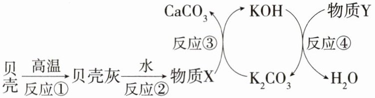 解析 碳酸钙高温分解为氧化钙和二氧化碳,氧化钙与水反应得到氢氧化钙(物质X),氢氧化钙与碳酸钾反应得到碳酸钙和氢氧化钾,氢氧化钾与二氧化碳反应得到碳酸钾和水。