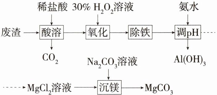 10.「2024江苏南通中考」实验室以一种工业废渣(主要成分为$MgCO_{3}$,含少量$FeO$、$Fe_{2}O_{3}$、$Al_{2}O_{3}$)为原料制备$MgCO_{3}$。实验过程如下: