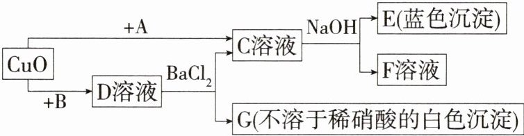 解析 根据框图中物质转化关系分析可知,不溶于稀硝酸的沉淀G为硫酸钡,C溶液和氢氧化钠反应会生成蓝色沉淀E和F溶液,所以E为氢氧化铜,C溶液中含有铜离子,由复分解反应的原理可知,D溶液中含有铜离子,D为硫酸铜,B为硫酸,C为氯化铜,F为氯化钠,A为盐酸,经过验证,推导正确。