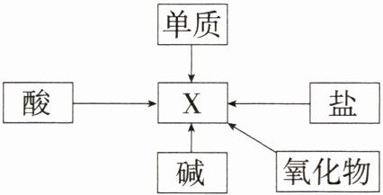 9.「2023丽水中考,★☆」小科学习了物质的性质后,梳理单质、氧化物、酸、碱、盐与X之间的转化关系如图所示。“→”表示某一种物质经一步反应可转化为另一种物质,部分反应物、生成物及反应条件已略去。