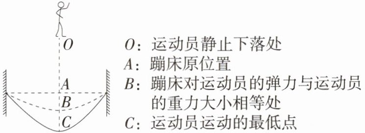 (填“A”“B”或“C”)点时其动能达到最大值。(3)某次运动员下落至A点时的动能大小为E₀,后反弹至比原先更高的位置,在反弹过程中向上经过A点时的动能大小为$E_1,$请比较$E₀$