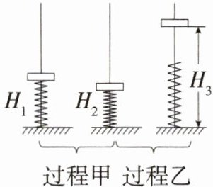 7. [2025杭州余杭期末,☆☆]如图所示,将弹簧和光滑杆一端竖直固定在桌面上,光滑杆居于弹簧的中心位置,光滑杆上再套一块中间有孔的木块后,木块静止在距桌面$H_1$的高度处。用手将该木块从$H_1$高度按压至$H_2$处(如图过程甲),松手后,木块从$H_2$处上升到最大高度$H_3$处(如图过程乙)。所有摩擦均忽略不计。下列说法正确的是 (