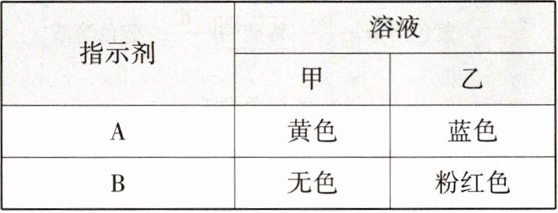 9.新中考对比分析法「★☆」有A、B两种酸碱指示剂,它们显示的颜色与溶液pH的关系如图所示,它们在甲溶液和乙溶液中显示的颜色见下表。下列判断错误的是(