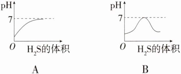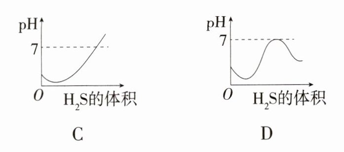 10.B 酸性溶液的pH小于7,且酸性越强,溶液的pH越小。随着反应3H₂S+H₂SO₄=4S↓+4H₂O的发生,溶液的酸性变弱,pH会不断变大,图像会是一条上升的曲线;至溶液中H₂SO₄恰好完全反应时,pH等于7,继续通入硫化氢气体,溶液会再次显酸性,但由于氢硫酸的酸性弱于硫酸,故溶液最后的pH会比开始时大。
