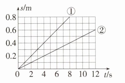 D 由图知,当$t=8s$时,$s_{1}=0.8m,s_{2}=0.4m$,则$v_{1}=\frac {s_{1}}{t}=\frac {0.8m}{8s}=0.1m/s,v_{2}=\frac {s_{2}}{t}=\frac {0.4m}{8s}=0.05m/s$,故$v_{1}>v_{2}$,故A错误;两次水平拉动同一物体在同一水平面上做匀速直线运动时,物体对水平面的压力和接触面的粗糙程度相同,受到的滑动摩擦力不变,而物体受到的滑动摩擦力和拉力是一对平衡力,所以两次物体所受的拉力$F_{1}=F_{2}$,C错误;由图像可知,0~6s内物体第1次通过的路程大于第2次通过的路程,由$W=Fs$可知,$W_{1}>W_{2}$,故B错误;由$P=\frac {W}{t}$可知,0~6s内两次拉力对物体做功的功率:$P_{1}>P_{2}$,D正确。故选D。