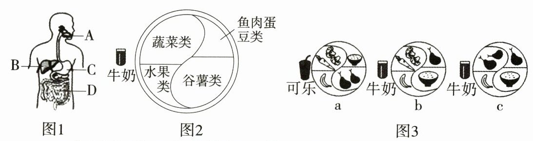 (2)医生推荐小明按照图2所示的“中国居民平衡膳食餐盘”调整饮食结构。该餐盘描述了一餐中的食物组成,其中占比较大的为谷薯类和