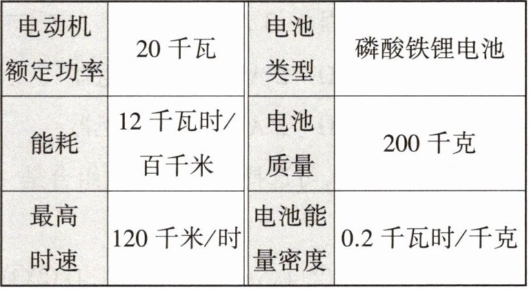 (2)电池总电量:Q总=0.2kW·h/kg×200kg=40kW·h;充满电后,可利用的电量Q'=90%Q总=90%×40kW·h=36kW·h,最佳续航里程: $\frac{36kW·h}{\frac{12kW·h}{100km}}$=300km;