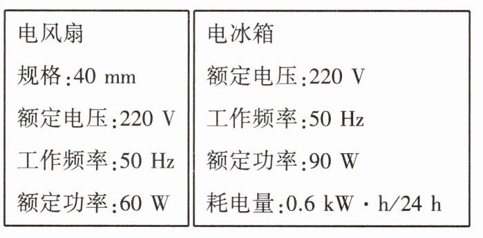 C 电风扇主要将电能转化为机械能,故A错误;根据铭牌可知,电风扇的电功率小于电冰箱的电功率,如果二者工作时间相同,那么电风扇消耗的电能小于冰箱,故B错误;因为冰箱的额定功率大于电风扇的额定功率,所以两用电器正常运转时,冰箱耗电更快,故C正确;24小时电风扇消耗的电能为W=Pt=0.06kW×24h=1.44kW·h>0.6kW·h,故D错误。故选C。