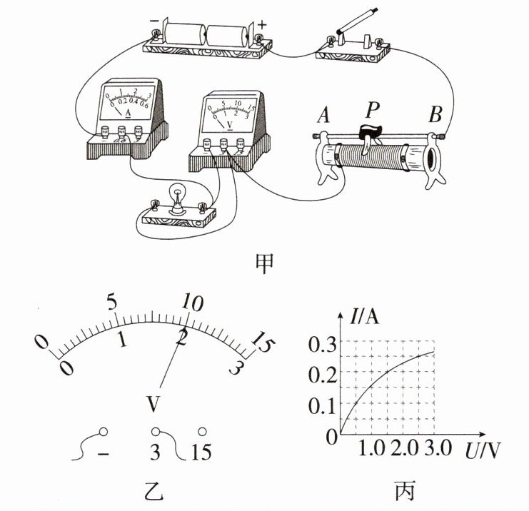解析 (1)闭合开关,移动滑动变阻器的滑片P到某一位置,电压表示数如图乙所示,电压表选用小量程,分度值为0.1V,其示数为2V,小于灯泡的额定电压2.5V,为了测得小灯泡的额定功率,应增大灯泡两端的电压,根据串联电路电压规律,应减小滑动变阻器两端的电压,根据串联电路分压规律可知,应减小滑动变阻器接入电路的阻值,故应将滑动变阻器的滑片P向A端移动,使电压表的示数为2.5V;(2)由图丙可知,当灯泡两端电压为2.5V时,通过灯泡的电流为0.25A,则小灯泡的额定功率为$P = UI = 2.5V×0.25A = 0.625W$。