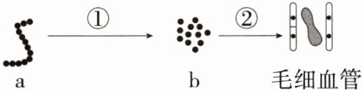 A 由图可知,过程①表示消化过程,过程②表示吸收过程,若a表示淀粉,则经过②吸收过程,血糖的含量会升高,A正确;若a表示蛋白质,则过程①是将蛋白质分解为氨基酸的消化过程,B错误;若b表示脂肪酸,则参与过程①的是肠液、胰液等,胃液不能消化脂肪,C错误;蛋白质在胃中胃蛋白酶的作用下被初步消化,然后进入小肠,在小肠中肠液和胰液中酶的作用下变成氨基酸,若b表示氨基酸,则过程①不只发生在胃中,D错误。