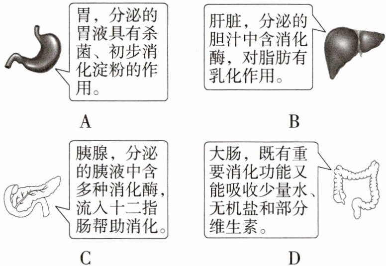 C 胃液能初步消化蛋白质,A错误。肝脏分泌的胆汁中不含消化酶,B错误。胰腺分泌的胰液中含多种消化酶,流入十二指肠帮助消化,C正确。大肠没有重要的消化功能,主要是吸收少量水、无机盐和部分维生素,D错误。