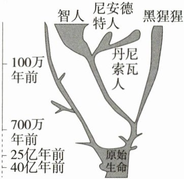 解析 从题图可以看出黑猩猩和智人是由共同的祖先进化而来的,A 错误。从题图可看出丹尼索瓦人出现在大约 100 万年前,B 错误。生物进化的规律是从低等到高等,从简单到复杂,从水生到陆生,C 错误。从题图可以看出智人、尼安德特人由同一分支演化而来,有共同的祖先,D 正确。