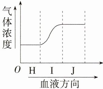 B H为肺动脉,内流静脉血,流经I时,气体浓度升高,说明发生了气体交换。I为肺部毛细血管,血液流经I肺部毛细血管时,肺泡内的氧气扩散进入血液,血液中氧气的含量增加,因此曲线表示氧气的浓度,B正确。
