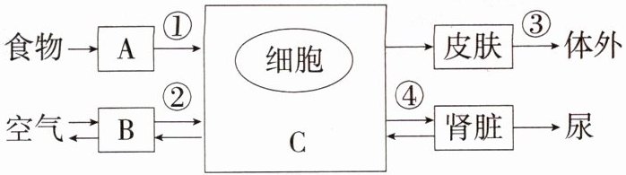 解析 (1)分析题图可知,A 是食物进入体内的系统,应为消化系统,①是消化系统中的营养成分进入血液循环的过程,代表吸收过程。(2)温度升高或剧烈运动时,为了散失体内产生的热量,皮肤会通过③排汗散失大量的水分,通过汗液蒸发散热,以维持体温的恒定。(3)肾脏中形成的尿液,经过肾盂流入输尿管,再流入膀胱,在膀胱内暂时贮存;膀胱内贮存了一定的尿液后,在大脑的支配下,尿液经尿道排出体外。所以形成尿液的过程是连续的,而尿的排出是间歇的,故选 B。