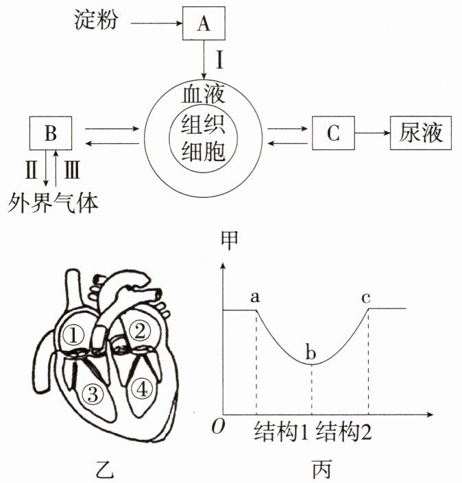 6. 「2023 宁波中考模拟」图甲中 A、B、C 代表健康人体不同的系统或器官,Ⅰ、Ⅱ、Ⅲ表示相关物质,图乙中①②③④表示心脏的四个腔。请分析并回答下列问题: