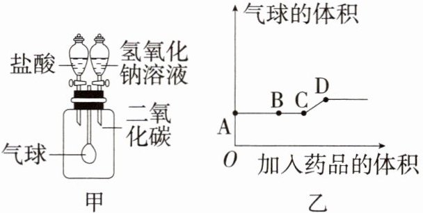 答案 (1)盐酸 (2)$NaOH + HCl = NaCl + H_{2}O$ (3)氢氧化钠溶液与二氧化碳反应生成碳酸钠和水,消耗了瓶中的二氧化碳气体,瓶内的压强减小,气球体积增大
