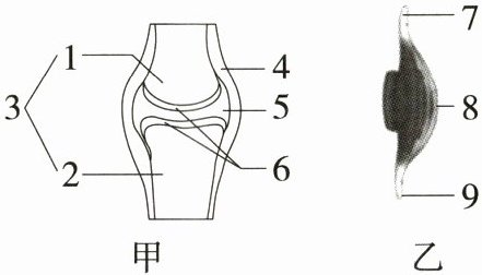 8. 「2024山东滨州中考」校园内的“阳光体育”活动促进了青少年的健康成长。甲、乙两图分别是关节和骨骼肌的结构示意图。下列叙述正确的是 (