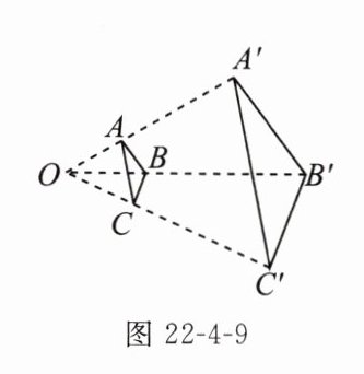 2. (2023长春)如图22-4-9,$\triangle ABC$和$\triangle A'B'C'$是以点O为位似中心的位似图形,点A在线段$OA'$上. 若$OA:AA'=1:2$,则$\triangle ABC$与$\triangle A'B'C'$的周长之比为____