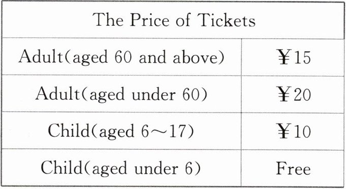 ()2. On Children's Day, Tom, a junior middle school student, went to Children's Amusement Park with his mother and his 60-year-old grandparents. According to the price list, they paid ______ yuan for the tickets.