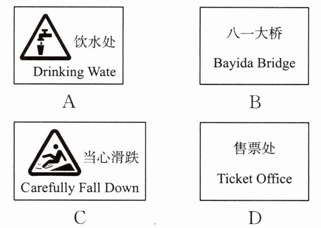 1. D 考查标志词的用法。“饮水处”应为“Drinking water”;“八一大桥”应为“Bayi Bridge”;“当心滑跌”应为“Caution Wet Floor”。只有 D 项正确。