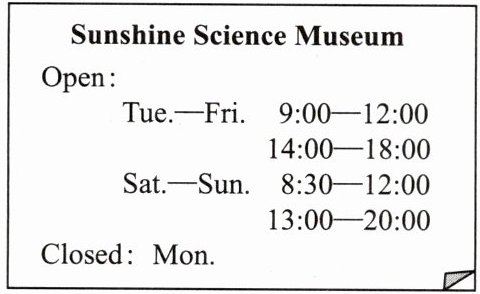 D 考查提取信息。句意:请看下面的告示牌。周三下午阳光科学博物馆开放多长时间? 根据下面告示牌中“Tue. —Fri. 14:00—18:00”可知开放 4 个小时。故选 D。