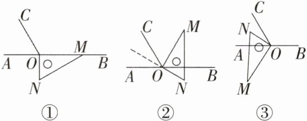 (1)将图①中的三角尺绕点O逆时针旋转至图②,使一边OM在$∠BOC$的内部,且恰好平分$∠BOC$.问:此时直线ON是否平分$∠AOC$?并说明理由.