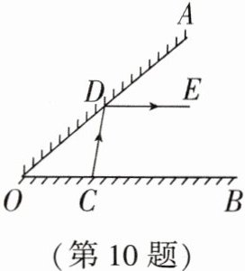 10. 如图,$∠AOB的一边OA$是平面镜,$∠AOB= 40^{\circ }$,点$C是OB$上一点,一束光线从点$C$射出,经过平面镜$OA上的点D反射后沿射线DE$射出,已知$∠ODC= ∠ADE$,要使反射光线$DE// OB$,则$∠CDE$的度数是____度.