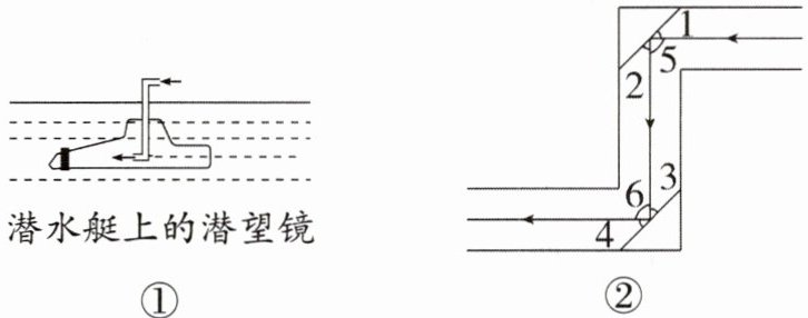 21. (10分)你知道潜水艇吗?它在军事上的作用非常大. 潜水艇下潜后,艇内人员可以用潜望镜来观察水面上的情况,如图①. 其实它的原理非常简单,如图②,潜望镜中的两个平面镜与水平方向的夹角都为$45^{\circ }$,光线经过镜子反射时,$∠1= ∠2$,$∠3= ∠4$. 你能解释为什么进入潜望镜的光线和离开潜望镜的光线是平行的吗?