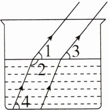 14. 光线从水中射向空气时,要发生折射.由于折射率相同,所以在水中的平行光线,在空气中也是平行的.如图,两条平行光线从水中射入空气,在水平面上发生折射.若$∠2-∠1= 75^{\circ}$,则$∠3与∠4$度数的和是______.