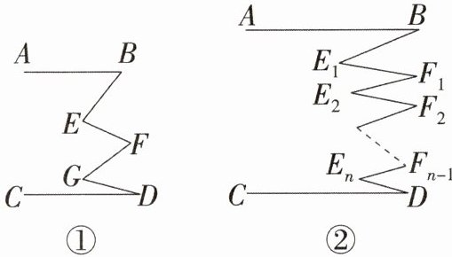 (1)∠E+∠G=∠B+∠F+∠D.证明:过点E向右作EM//AB,过点F向左作FN//AB,过点G向右作GH//AB.因为AB//CD,所以AB//EM//FN//GH//CD,所以∠B=∠BEM,∠MEF=∠EFN,∠NFG=∠FGH,∠HGD=∠D,所以∠BEF+∠FGD=∠BEM+∠MEF+∠FGH+∠HGD=∠B+∠EFN+∠NFG+∠D=∠B+∠EFG+∠D,即∠E+∠G=∠B+∠F+∠D.