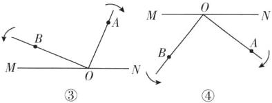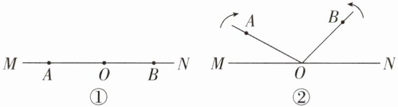 ①如图②,当 $ 0 \leq t \leq 18 $ 时,此时,$ \angle AOB + \angle AOM + \angle BON = 180^{\circ} $,所以 $ 90 + 4t + 6t = 180 $,解得 $ t = 9 $。