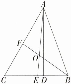 14. 如图,△ABC 中,AD 是高,AE,BF 是角平分线,它们相交于点 O,∠CAB= 50°,∠C= 60°,求∠DAE 和∠BOA 的度数。