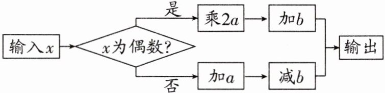 18. (8分)程序框图的算法思路源于我国古代数学名著《九章算术》,如图所示的程序框图,当输入$x$的值为4时,根据程序计算,输出的结果为5;当输入$x$的值为3时,根据程序计算,输出的结果为7,请你计算该程序框图中$a$,$b$的值。