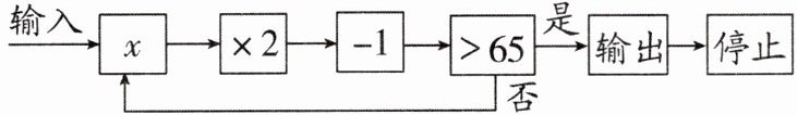 4 解析:根据题意得第一次:$ 2x - 1 $,第二次:$ 2(2x - 1) - 1 = 4x - 3 $,第三次:$ 2(4x - 3) - 1 = 8x - 7 $,第四次:$ 2(8x - 7) - 1 = 16x - 15 $,根据题意得$ \begin{cases} 2x - 1 \leq 65, \\ 4x - 3 \leq 65, \\ 8x - 7 \leq 65, \\ 16x - 15 > 65, \end{cases} $