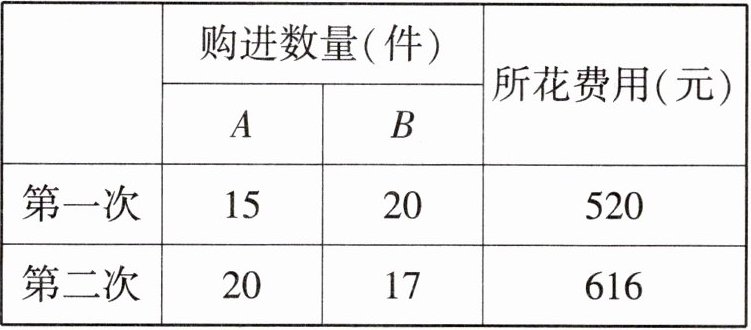 由题意得$ \begin{cases} 15x + 20y = 520, \\ 20x + 17y = 616, \end{cases} $解得$ \begin{cases} x = 24, \\ y = 8. \end{cases} $