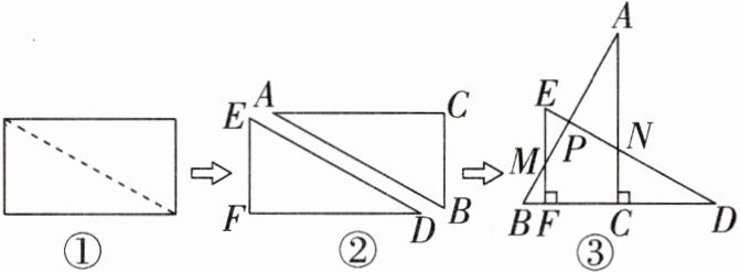 21. (10分)如图①,将一张矩形纸片沿对角线剪开,得到两张三角形纸片,如图②,再将这两张三角形纸片摆成如图③所示的形式,使点$B$,$F$,$C$,$D$在同一条直线上.