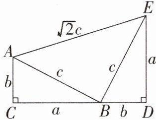 19. (8分)如图,四边形ACDE是证明勾股定理时用到的一个图形,a,b,c是Rt△ABC和Rt△BED的边长,易知AE= $\sqrt{2}c$,这时我们把关于x的形如$ax^2+\sqrt{2}cx+b= 0$的一元二次方程称为“勾系一元二次方程”.若x= -1是“勾系一元二次方程”$ax^2+\sqrt{2}cx+b= 0$的一个根,且四边形ACDE的周长是$6\sqrt{2}$,求△ABC的面积.