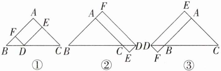 (2)当点D在边BC的延长线上时(如图②)或当点D在边BC的反向延长线上时(如图③),线段DE,DF,BC又有怎样的数量关系?请直接写出你的猜想,并选择其中一种情况加以证明.