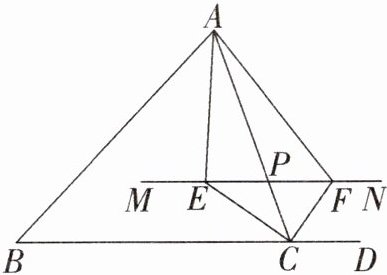 21. (10分)如图,在 $\triangle ABC$ 中,$MN// BD$ 交 $AC$ 于点 $P$,$\angle ACB$,$\angle ACD$ 的平分线分别交 $MN$ 于点 $E$,$F$。